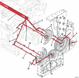 康明斯QSK95主機油油道 至 1 號主軸承的機油供應(yīng) 至燃油泵惰輪、燃油泵驅(qū)動裝置機油濾清器座和左排附件驅(qū)動裝置襯套的機油供應(yīng)(如果配備) 至齒輪室中的燃油泵驅(qū)動裝置襯套、燃油泵驅(qū)動裝置中的襯套和左排附件驅(qū)動裝置襯套的機油供應(yīng) 至康明斯QSK95燃油泵惰輪的機油供應(yīng) 至凸輪軸復(fù)合惰輪的機油供應(yīng) 至右排附件驅(qū)動裝置的機油供應(yīng)(如果配備) 至燃油泵驅(qū)動裝置中的襯套的機油供應(yīng) 至水泵、水泵惰輪和機油泵惰輪的機油供應(yīng) 至水泵惰輪的機油供應(yīng) 至康明斯QSK95水泵和機油泵惰輪的機油供應(yīng) 至康明斯QSK95水泵的機油供應(yīng)
