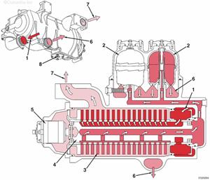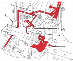 來自缸體主油道的機油供應(yīng) 機油供應(yīng)歧管 至左排渦輪增壓器的機油供應(yīng) 至右排渦輪增壓器的機油供應(yīng) 渦輪增壓器機油回油管 排放至油底殼的機油。