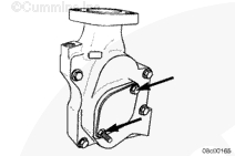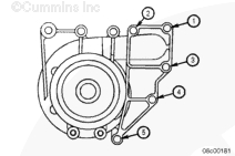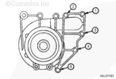 使用清潔的康明斯發(fā)動(dòng)機(jī)機(jī)油潤(rùn)滑所有水泵螺栓的螺紋和螺栓端頭底部。安裝水泵和兩個(gè)下部螺栓。擰緊螺栓,將水泵固定到位。
