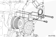 利用導(dǎo)向適配器上的定位銷(xiāo)(4)(如果配備),將惰輪皮帶輪(1)和導(dǎo)向適配器(2)軸與皮帶張緊輪支架(3)對(duì)正。使用一個(gè)墊圈和螺栓,將皮帶惰輪皮帶輪和軸安裝在皮帶惰輪支架上。擰緊螺栓。扭矩值: 30 n.m [25 ft-lb]。安裝防塵密封圈。