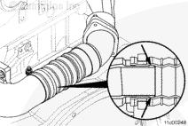 確保軟管端附近的凹槽滑過(guò) EGR 閥安裝支架上的軟管密封條。在此鋸齒狀凹槽內(nèi)定位軟管卡箍。擰緊軟管卡箍。