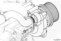 注: 要拆卸和安裝水泵,早期的、在中間鋁制皮帶張緊器惰輪支架上沒(méi)有縫槽的發(fā)動(dòng)機(jī)需要拆下減振器。