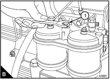對于裝配獨立濾芯的濾清器:松開濾清器座頂部的放氣旋塞(B1)或banjo螺栓。