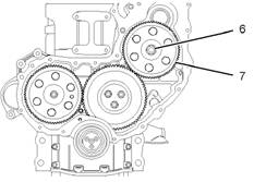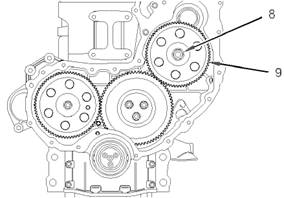 2.松開鎖緊螺釘(5)。轉(zhuǎn)動(dòng)隔套(6),以便將鎖緊螺釘(5)擰緊抵到噴油泵的軸上。逆時(shí)針方向轉(zhuǎn)動(dòng)噴油泵齒輪來消除齒隙。將鎖緊螺釘(5)擰緊至扭矩17N·m(13lbft)。