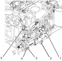 2.松開鎖緊螺釘(3)。轉(zhuǎn)動(dòng)隔套(4),以便將鎖緊螺釘(3)擰緊抵到噴油泵的軸上。逆時(shí)針方向轉(zhuǎn)動(dòng)噴油泵齒輪來消除齒隙。將鎖緊螺釘(3)擰緊至扭矩13N·m(9.6lbft)。