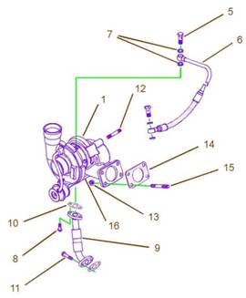 8.拆下調(diào)整螺釘(8)。從渦輪增壓器(1)上拆下排油管組件(9)。拆下接頭(10)并棄置。如有必要,拆下調(diào)整螺釘(11),然后從缸體上拆下排油管組件(9)。棄置接頭。