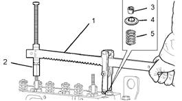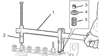 3.將氣門彈簧壓縮器(1)在缸蓋上安裝入位,以壓縮相關(guān)氣門彈簧(5)。壓縮氣門彈簧(5)。