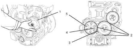2.將27610211曲軸正時銷(3)穿過殼體(前),插入曲軸連接臂。將27610212凸輪軸正時銷(4)穿過凸輪軸齒輪(5),插入殼體(前)。