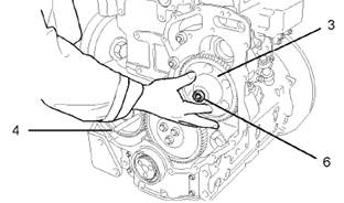 8.將噴油泵齒輪(3)安裝到噴油泵軸上。確保噴油泵齒輪(3)與惰齒輪(2)正確嚙合。安裝墊圈和螺母(6)并用手?jǐn)Q緊。