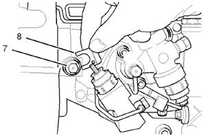 11.松開鎖定的噴油泵軸。為了解鎖BoschEPVE噴油泵軸,松開鎖緊螺釘(7)并安裝墊圈(8)。以(12N·m)7lbft(扭矩擰緊鎖緊螺釘)9,使其抵到墊圈(8)上。