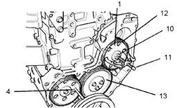 10.確保對準(zhǔn)齒輪(1)、(2)和(3)上的所有正時標(biāo)記。