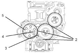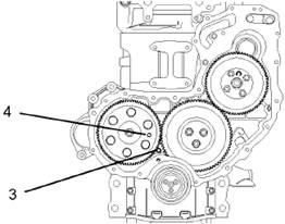 2.確保1號氣缸仍處在其壓縮沖程的上止點位置。如有必要,請參閱《Perkins1103/1104柴油發(fā)動機測試和調整手冊》,“查找1號活塞的上止點位置”。確保安裝了曲軸正時銷(3)和凸輪軸正時銷(4)。