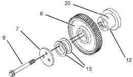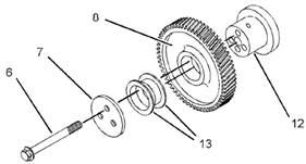 7.解體惰齒輪(8)的組件(9)和輪轂。為了解體標準組件(9),將輪轂(12)滑出惰齒輪(8).檢查惰齒輪(8)中的襯套(13)有無磨損或損壞。如有必要,從惰齒輪(8)的每側拆下襯套(13)。