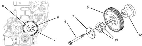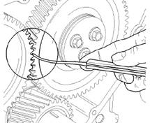 10.檢查惰齒輪和曲軸齒輪之間的齒隙。更多信息,請參閱《技術參數手冊》,“前齒輪總成”。