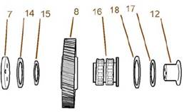 1.檢查齒輪(7)的齒和花鍵、軸承(8和9)、彈性擋圈(5)以及前殼體(6)中彈性擋圈凹槽的磨損和損壞情況。更換任何磨損或者損壞的零件