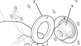 3.將一層少量、連續(xù)(12)的21820603POWERPARTRetainer(耐油)涂到軸承(9)的內表面上。將軸承(9)內座圈的正面放置到一個合適的支座上。將齒輪(7)較小的軸按入軸承(9)中,使齒輪的肩抵到軸承上。清除所有多余的密封膠。