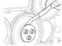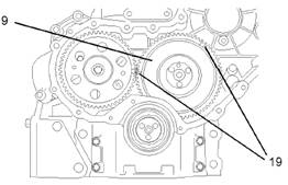 注:組裝惰齒輪和輪轂的組件(9)時,確保惰齒輪(8)上的標記(19)朝向發(fā)動機前端。