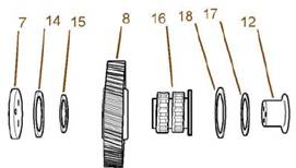 8.為了解體重型惰齒輪組件,將輪轂(12)推壓出軸承組件(16)。從惰齒輪(8).拆下簧圈(14)和止推墊圈(15)。如果軸承組件(16)磨損和/或損壞,將軸承組件滑出惰齒輪(8)。棄置軸承組件(16)。拆卸簧圈(17)和止推墊圈(18)。