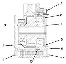 4.將前殼體(6)的法蘭盤放置到一個合適的支座上。從前殼體(6)推壓出齒輪(7)以及軸承(8和9)的組件。為了從齒輪(7)拆下軸承(8和9),使用一個合適的拉拔器。