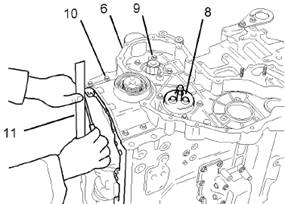 6.將前齒輪室(6)與缸體(11)下加工面對齊。使用適當的直尺和塞尺,檢查對中度(11)公差。更多信息,請參閱《技術參數手冊》,“殼體(前)和殼體(前)蓋”。