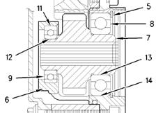 4.將一層少量、連續(xù)(14)的21820603POWERPARTRetainer(耐油)涂到軸承(8)的外表面上。將一層少量、連續(xù)(13)的21820603POWERPARTRetainer(耐油)涂到軸承(8)的內表面上。確保軸承(9)內座圈的前面仍在一個合適的支座上。將軸承(8)按壓到齒輪(7)的較大軸上,直至軸承(9)靠到齒輪的肩上。清除所有多余的密封膠。