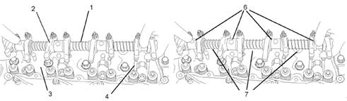 2.如果解體過搖臂軸組件,將27610227搖臂組裝工具(6)固定在搖臂(2)外周,以輕微壓縮彈簧(7)。在重新組裝期間,搖臂(2)必須保持遠(yuǎn)離缸蓋(3)的機(jī)加工面。
