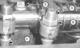 3.松開各個(gè)搖臂(2)上的螺母(8)和調(diào)整螺釘(9)。這有助于避免在搖臂軸安裝過程中氣門彎曲或推桿彎曲。