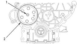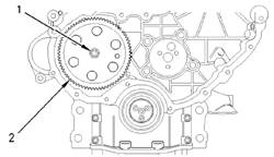 3.將調(diào)整螺釘(1)和墊圈安裝到凸輪軸齒輪(2)上。擰緊調(diào)整螺釘(1)至扭矩為95N·m(70lbft)。
