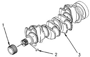 注:曲軸齒輪(1)可能在曲軸(3)上與其滑動配合。如果將曲軸(3)安裝在發(fā)動機(jī)內(nèi),先使用一個(gè)合適的工具,以確保曲軸齒輪(1)不是滑動配合,然后再從發(fā)動機(jī)上拆除曲軸。