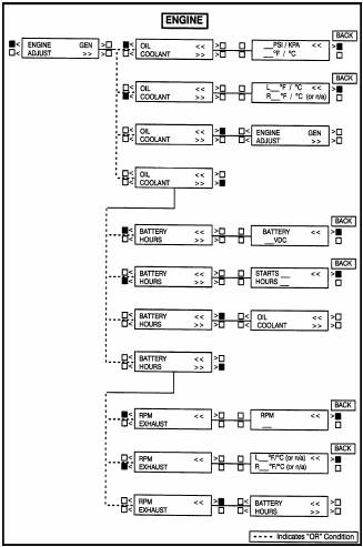 下一頁顯示了發(fā)動機(ENGINE)功能的方框圖。如果按顯示屏上“ENGINE”(發(fā)動機)附近的按鍵,將顯示第1個發(fā)動機子功能。如圖中所示,發(fā)動機功能下有三個子功能。