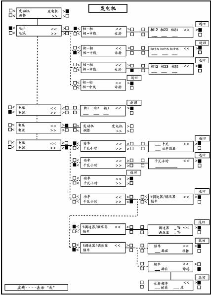 下一頁顯示了發(fā)電機(GEN)功能的方框圖,如果按下顯示屏上“GEN”(發(fā)電機)附近的按鍵,將出現(xiàn)第1個發(fā)電機子功能。如圖所示,發(fā)電機(GEN)功能下面又分為三個子功能。