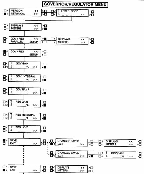 下一頁為調(diào)速器/調(diào)壓器(GOV/REG)子功能的方框圖,這是4項設定/標定(SETUP/CAL)功能中的第3項子功能。如果按主功能中“>>”符號旁邊的按鍵,將顯示版本/設定/標定(VERSION/SETUP/CAL)子功能。
