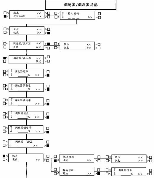 按“⇑”和“⇓”符號旁邊的按鍵以調(diào)整調(diào)速器/調(diào)壓器參數(shù),按“>>”符號旁邊的按鍵,進到下一功能。