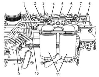 20.如有必要,將新的燃油濾清器(11)安裝到燃油濾清器底座(5)上。請參閱《操作和保養(yǎng)手冊》,“燃油系統(tǒng)細濾器-更換”以了解正確程序。