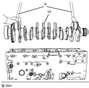 7將工具(A)和適當(dāng)?shù)钠鸬踉O(shè)備連接到曲軸(10)上。將曲軸(10)吊入缸體。曲軸的重量約為61kg(134lb)。