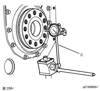 15.檢查曲軸的軸向間隙。向發(fā)動(dòng)機(jī)前部推動(dòng)曲軸。將工具(C)安裝到缸體及曲軸后表面上。向發(fā)動(dòng)機(jī)后部推動(dòng)曲軸。使用工具(C)測(cè)量曲軸軸向間隙。曲軸允許的軸向間隙為0.10mm(0.004in)至0.41mm(0.016in)。