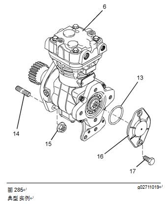 13.如有必要,拆下螺栓(17),然后卸下板(16)。從板(16)上卸下O形密封圈(13)。請參閱插圖285。