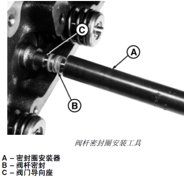 3. 用 JDG678 閥桿密封圈安裝器 (A) 將閥桿密封圈 (B)滑入閥桿內(nèi),套在閥門導(dǎo)向座 (C) 上。