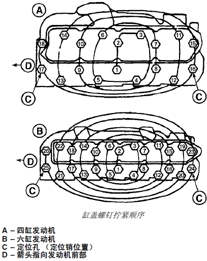 3. 擰緊所有帶帽螺釘(按上面所示位置)直到套筒扳手上的第二個標記 (B) 與缸蓋上的標記 (C) 對齊為止。