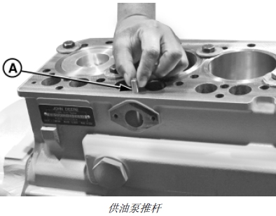 1. 安裝缸蓋前,在供油泵推桿 (A) (如果裝備)上涂抹干凈的John Deere約翰迪爾強鹿柴油發(fā)動機潤滑油,然后小心地裝到缸體中。