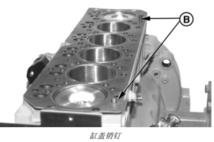 2. 如已拆下,在缸體定位孔中重新裝兩個定位銷(B)。