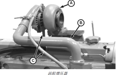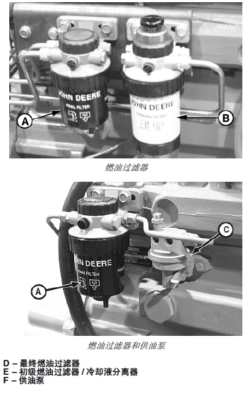 注意: 燃油過濾器(A) 和(B)、輸油泵(C) 的位置隨John Deere約翰迪爾強鹿柴油發(fā)動機和噴油泵型號的不同而有所改變。關(guān)于按要求拆卸過濾器和/ 或供油泵的步驟,請參見 CTM217(機械燃油系統(tǒng))、CTM179 (配有 Bosch VP44泵的 4 級電子燃油系統(tǒng))CTM341 (配有Stanadyne DE10 泵的 12 級電子燃油系統(tǒng))或CTM284 (只有英文版)(配有 Delphi/LucasDP201 泵的 1 級電子燃油系統(tǒng))的第 02 部分第090 章。