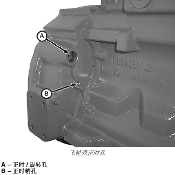 2. 拆下John Deere約翰迪爾強鹿柴油發(fā)動機正時/ 旋轉(zhuǎn)孔 (A) 和正時銷孔 (B) 上的塑料塞或蓋板。