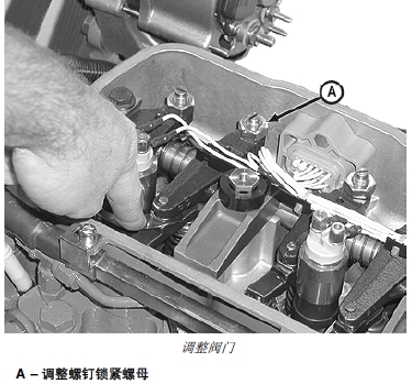 如果需要調(diào)整閥門,松開搖臂調(diào)節(jié)螺釘上的鎖緊螺母(A)。轉(zhuǎn)動調(diào)整螺釘直到塞尺的滑動略有阻力為止。用螺絲刀固定調(diào)整螺釘防止其轉(zhuǎn)動,同時按技術(shù)規(guī)格要求擰緊鎖緊螺母。擰緊鎖緊螺釘后再次檢查間隙。必要時,再次調(diào)整間隙。