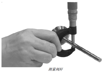 2. 測(cè)量閥桿外徑。測(cè)量閥桿外徑,記錄測(cè)量數(shù)據(jù)并與閥門導(dǎo)管內(nèi)徑相比較。(請(qǐng)參閱本章中的“測(cè)量閥門導(dǎo)管內(nèi)徑”部分。)