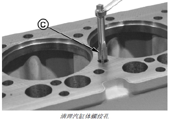 6. 如果汽缸體可保養(yǎng),應使用 JDG680 絲錐(C) 或同類1/2-13 UNC-2A x 76 毫米(3.0 英寸)絲錐將汽缸體基準面上的所有汽缸蓋固定帶帽螺釘孔過一遍。然后用壓縮空氣清理絲錐過孔時的碎屑或液體。