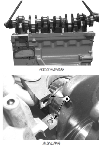 3. 安裝主軸瓦蓋,確保軸瓦蓋和汽缸體上的軸瓦榫塊(A) 位于汽缸體的同一側(cè)。
