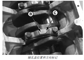重要提示: 主軸瓦蓋一定要安裝在各自拆卸時(shí)的位置。軸瓦蓋上的數(shù)字 (B) 應(yīng)與機(jī)體油盤(pán)架上的數(shù)字上合。裝軸瓦蓋上的箭頭 (C) 必須指向汽缸體凸輪軸一側(cè)。