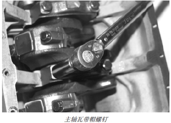 5. 對(duì)齊上下止推軸瓦,然后擰緊后主(止推)軸瓦帶帽螺釘。在曲軸和汽缸體加強(qiáng)筋間,用撬杠小心地將曲軸和主止推軸瓦蓋向后撬。然后,將曲軸向前移動(dòng)使之與止推軸瓦表面對(duì)齊。