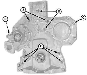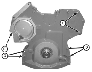 19. 拆卸正時(shí)齒輪蓋邊緣的帶帽螺釘 (C) 和John Deere約翰迪爾強(qiáng)鹿柴油發(fā)動(dòng)機(jī)前板后面的帶帽螺釘 (E)。拆卸正時(shí)齒輪蓋。